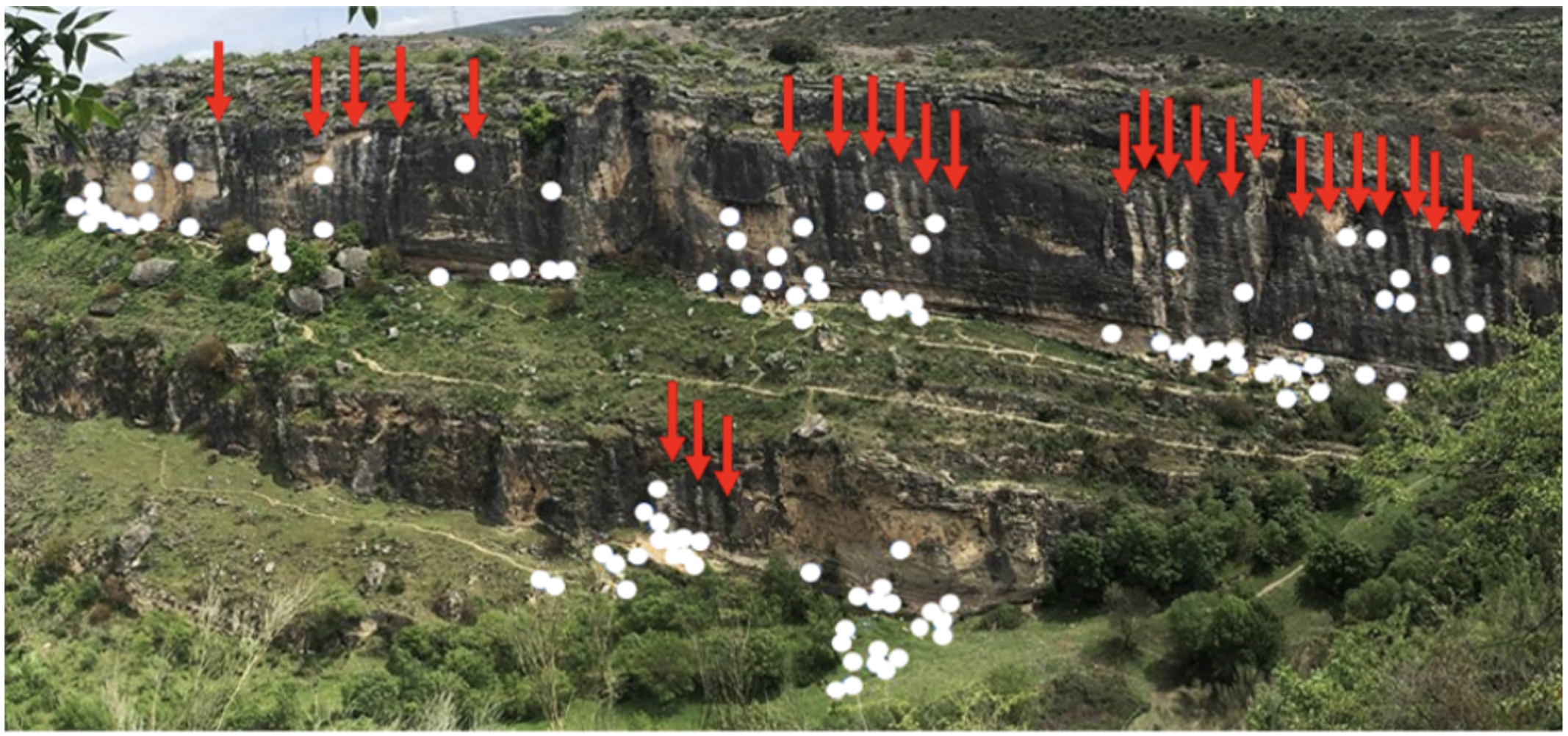 Figure 2: Climbing intensity in Patones (Madrid, Spain; April 2021). The white dots represent climbers present in the area at the time that the picture was taken, and the red arrows indicate the erosion caused by the repeated ascent of the climbers on the cliff face. Photo by Martí March-Salas.